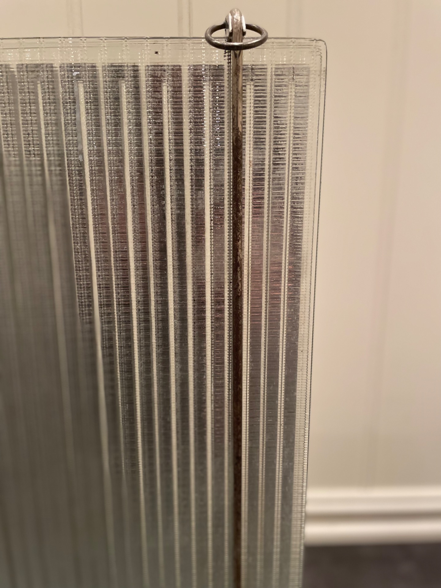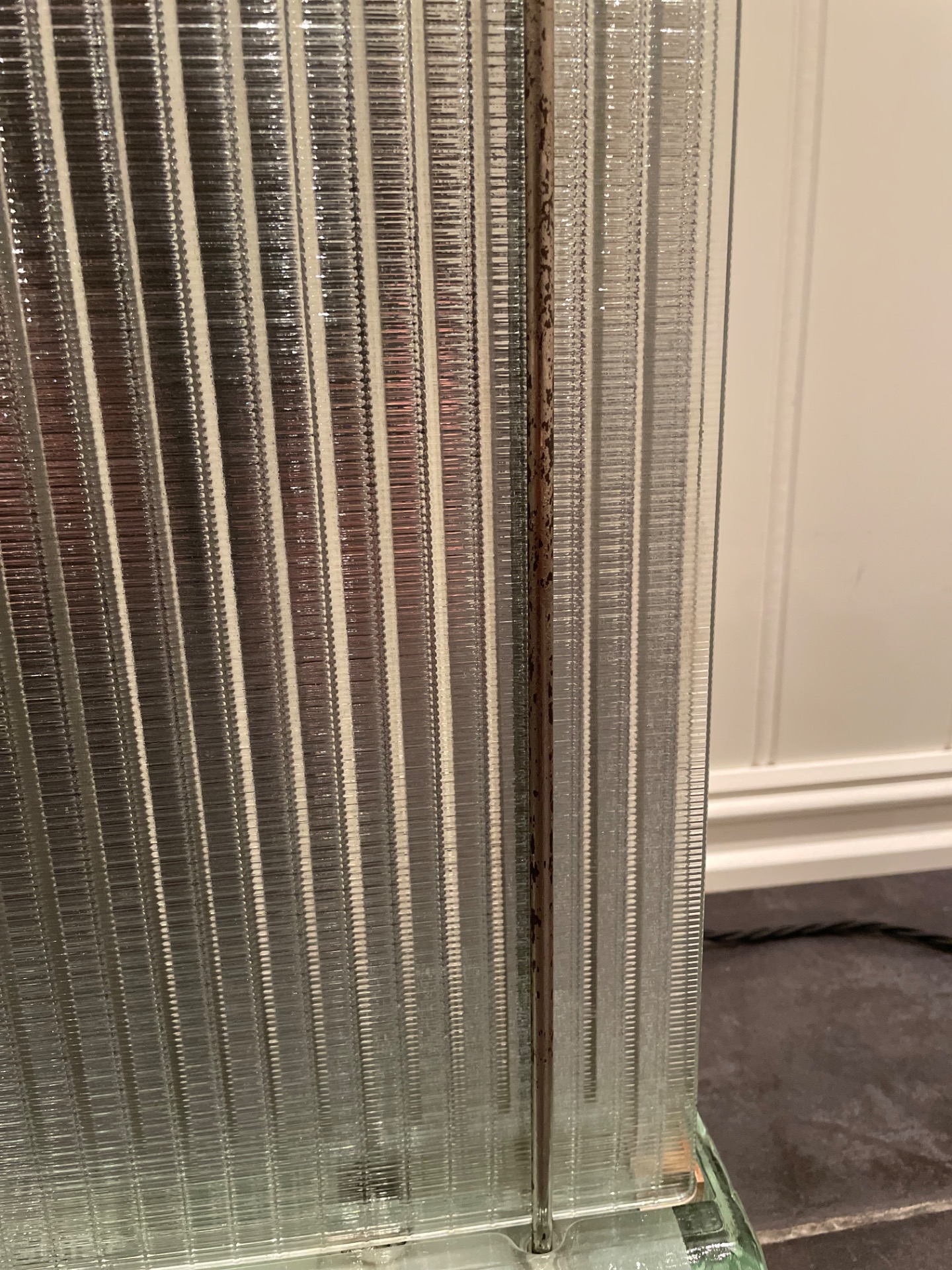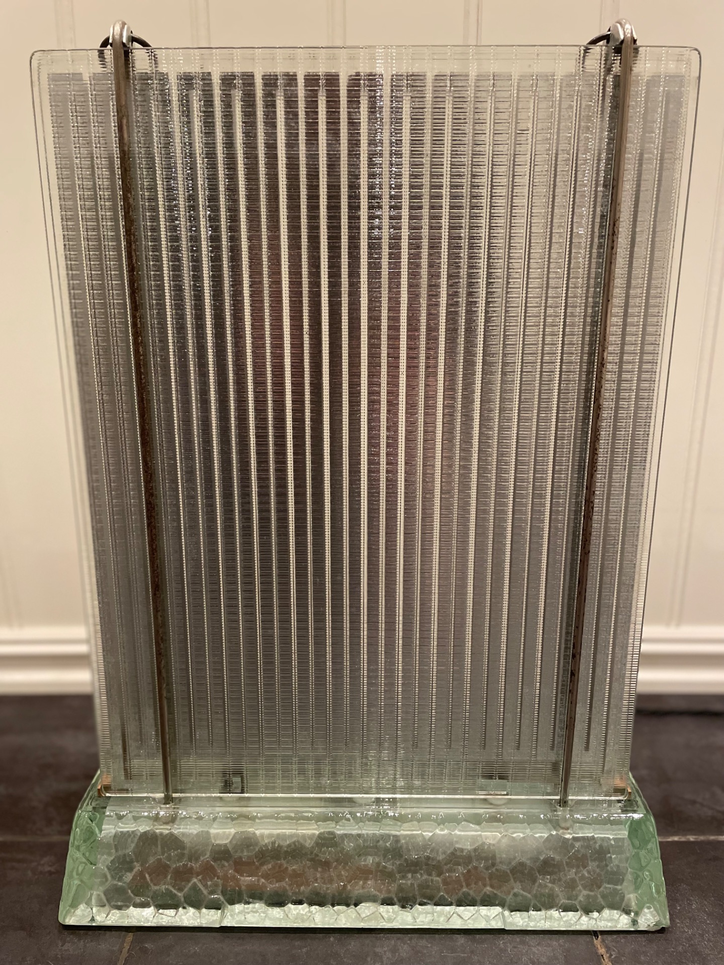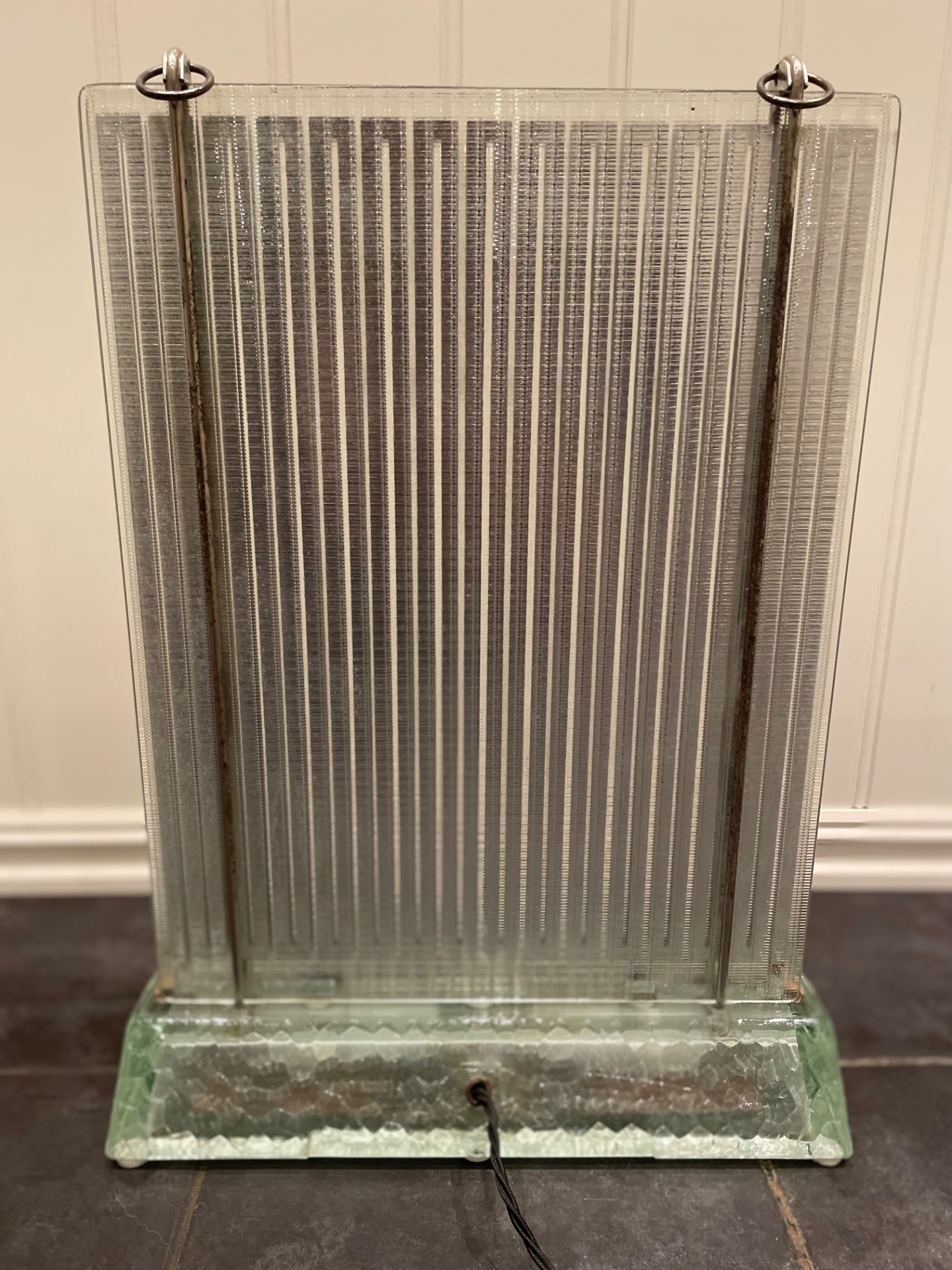 Selger nå en utrolig vakker, fransk art deco-glassradiator, som har blitt bygget om til en lampe. Den fungerer ikke lenger som varmeovn, da den opprinnelig ble bygget for 110V. Elementene er der men de er ikke koblet til.