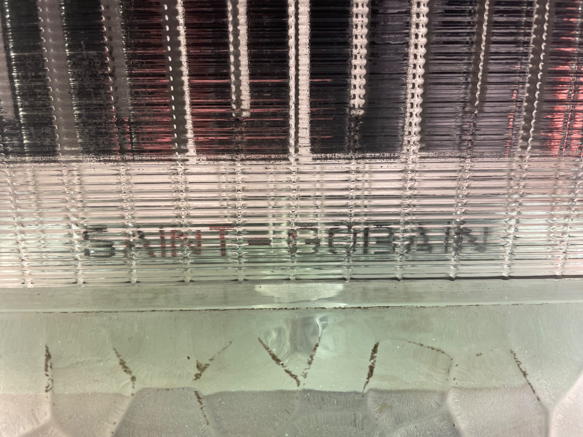 Den rektangulære basen er i støpt glass, merket ( etset inn ) "SAINT-GOBAIN", og basen lyser vakkert opp når pærene er påslått, samtidig som den gir et flott bakgrunnslys på veggen ( se bilder ).