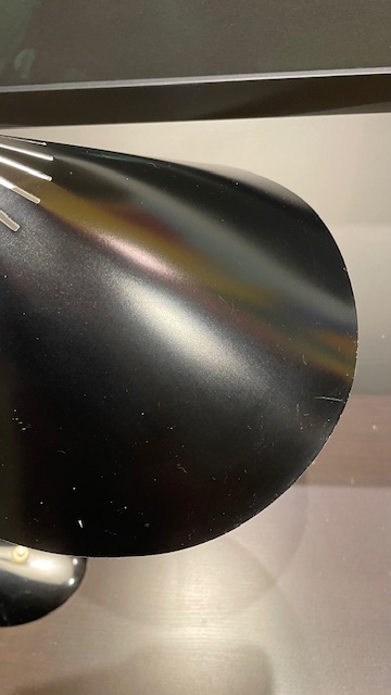 svanehals i messing, montert på en sort oval støpejernsfot. Hvitmalt innvendig,