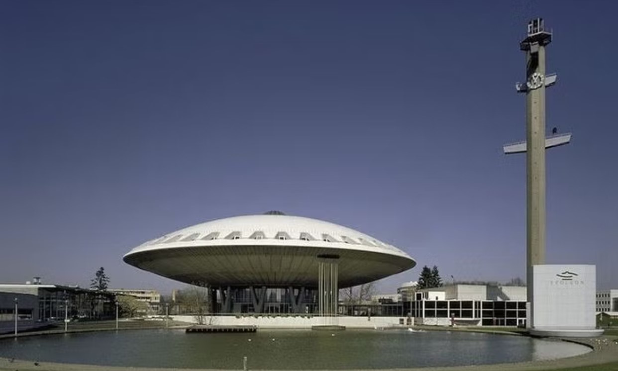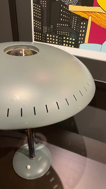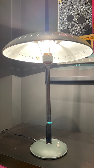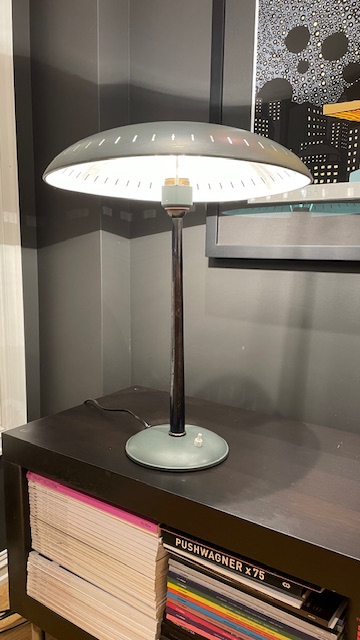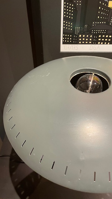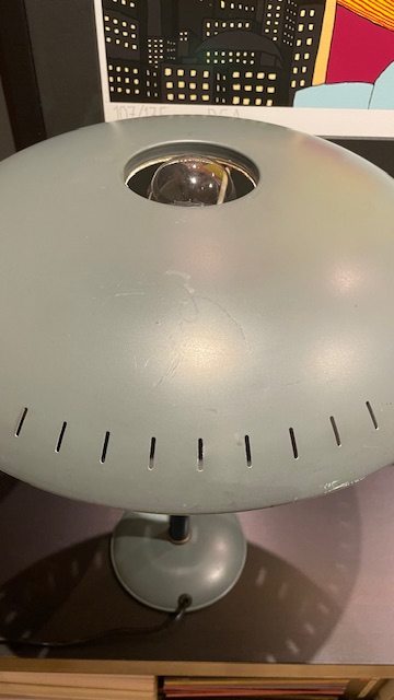Lampeskjermen har en "ufo" -design, typisk for romalderens tidsalder og avgir et vakkert diffust lys. Lampen har blitt forsiktig renset og rengjort, og er nå klar for sitt nye hjem! Dette er en solid designet og bygget kvalitetslampe med en fot i støpejern, en konisk, blånert "hals" i rustfritt stål, med en skjerm produsert i aluminium. På denne bør det benyttes en stor lyspære med "sølvtopp" ( følger ikke med ).Skjermen har noen få lette riper men til tross for det, er dette en flott lampe som pynter godt opp i hjemmet. Kalff brukte samme UFO-tema i sin design som arkitekt for Evoluon Eindhoven (se de siste to bildene). Produsert i Nederland på 50-tallet, produsert av Philips, Eindhoven.