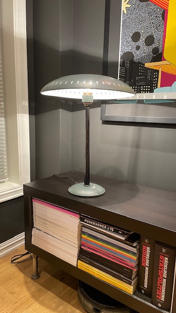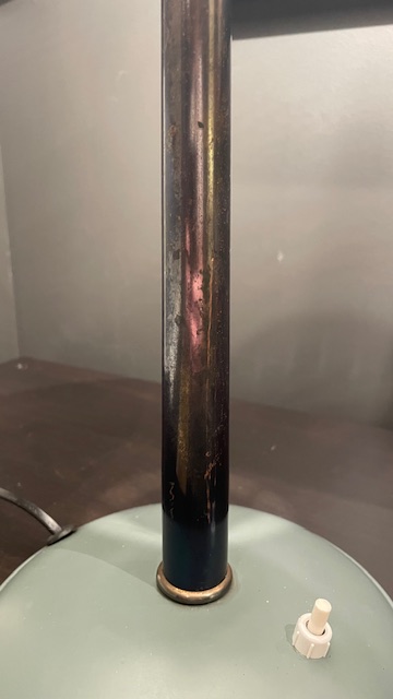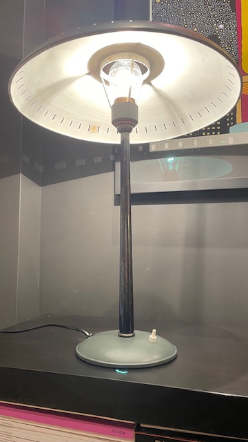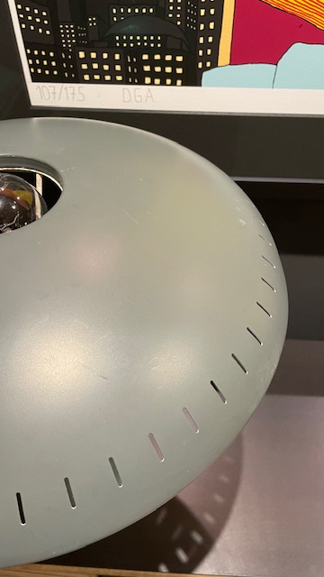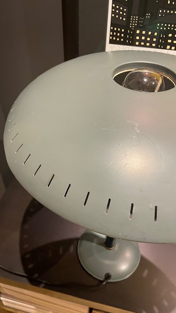 Dette er en utrolig flott lampe, som aldri har blitt restaurert, den har derfor noen få bruksmerker (se bilder ), men lampen er mellom 60 og 70 år gammel, så litt "patina" hører jo med :)Bryteren fungerer perfekt, ledningen og støpsel er byttet, da det gamle var utrygt.