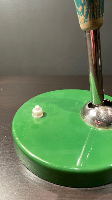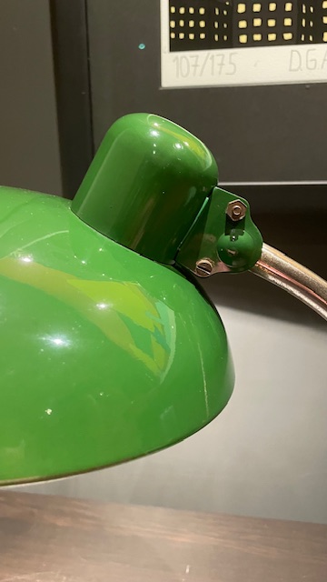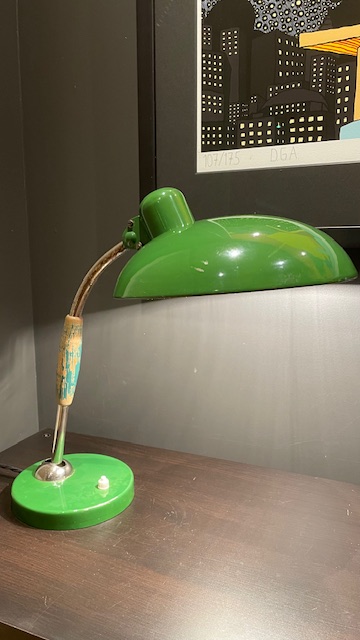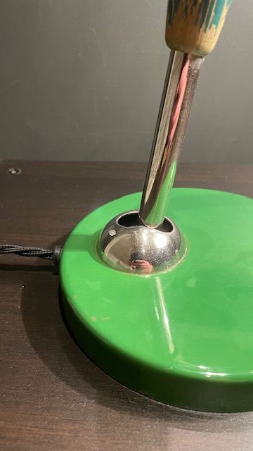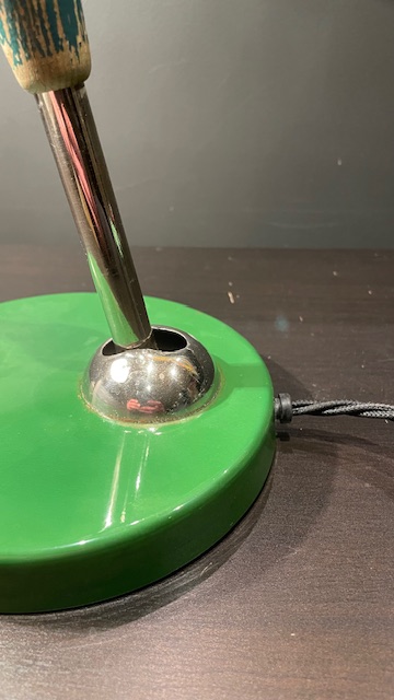The lamp is in good, original, vintage condition with normal, age-related wear and tear that gives it a great patina. The screen swivels and can be turned in almost any direction, while the arm can be adjusted back and forth. The arm is chromed and equipped with a handle of painted wood in the middle.