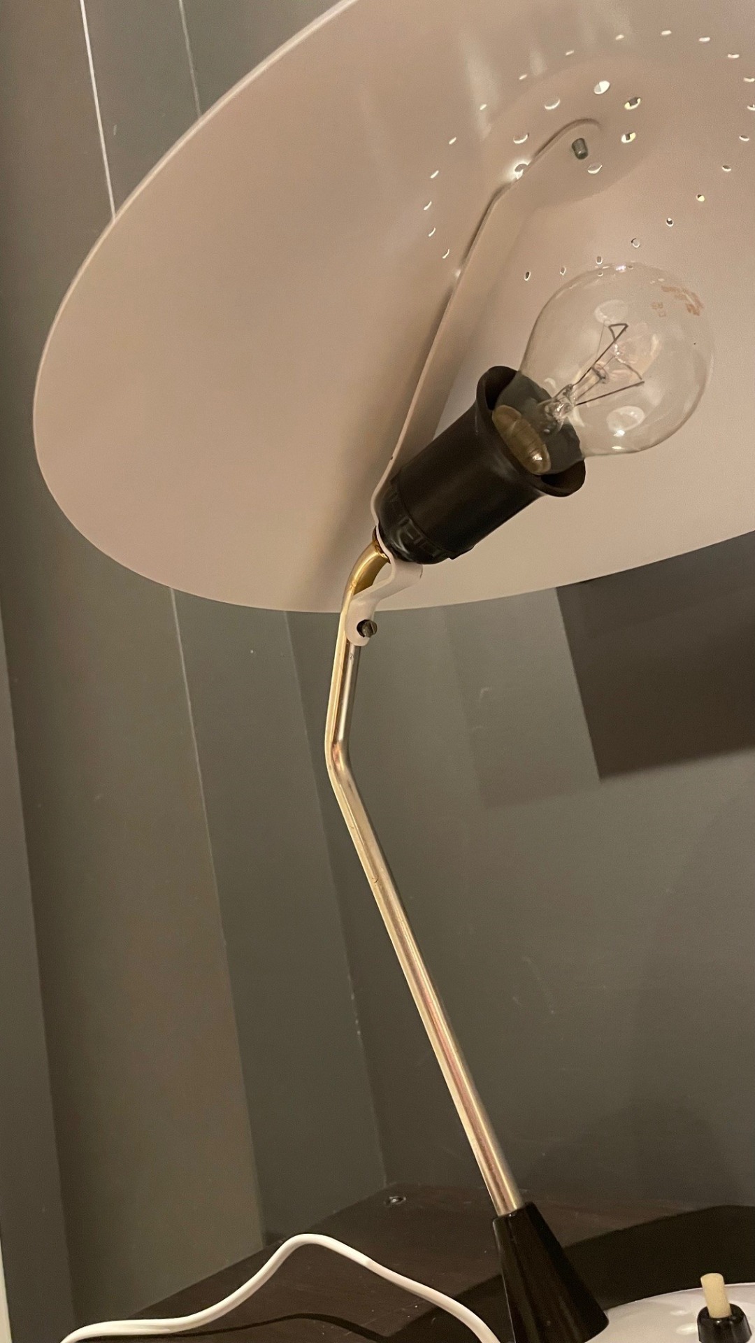 The lampshade and lamp base are made of steel, which is painted white. The paint is in very good condition, no serious defects, only very minimal, local signs of wear.
